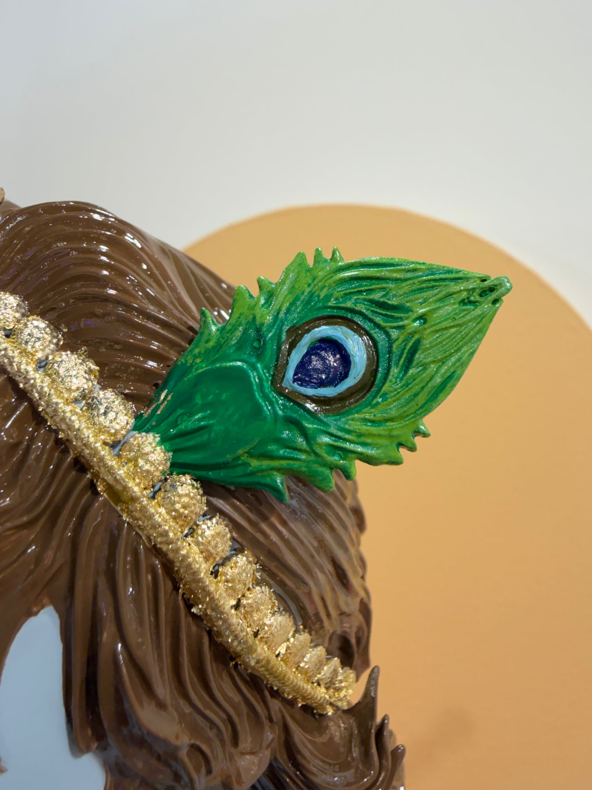 In the heart of Vrindavan, Bal Krishna leans gently against a pot of butter, his gaze calm and curious as he admires the simple delight before him. Every detail of his form reflects the innocence, charm, and quiet wonder of the divine child, a moment where curiosity and divinity meet.