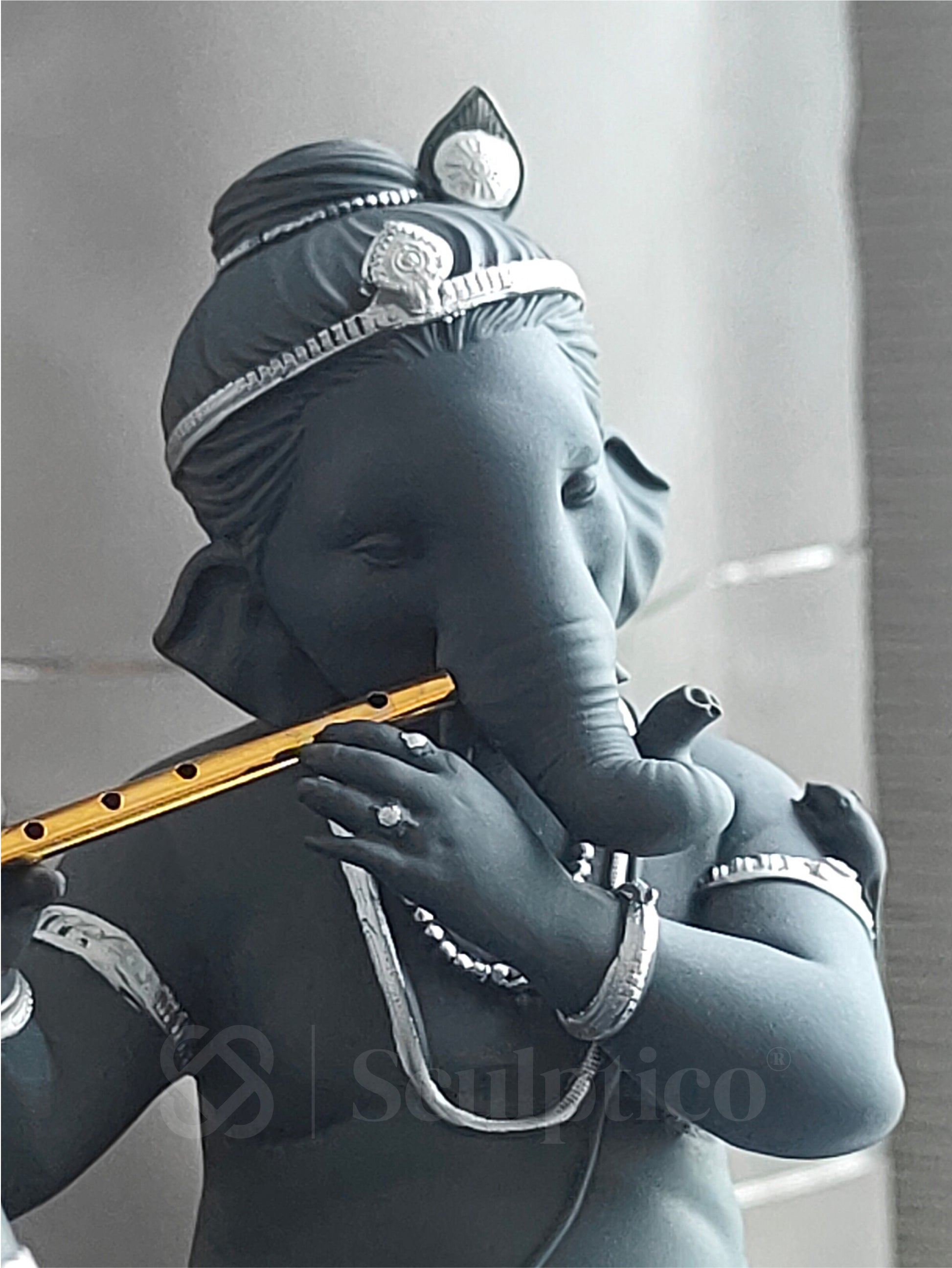 An earthy grey-toned Ganesha absorbed in melody. A refined collectible piece of natural devotion.