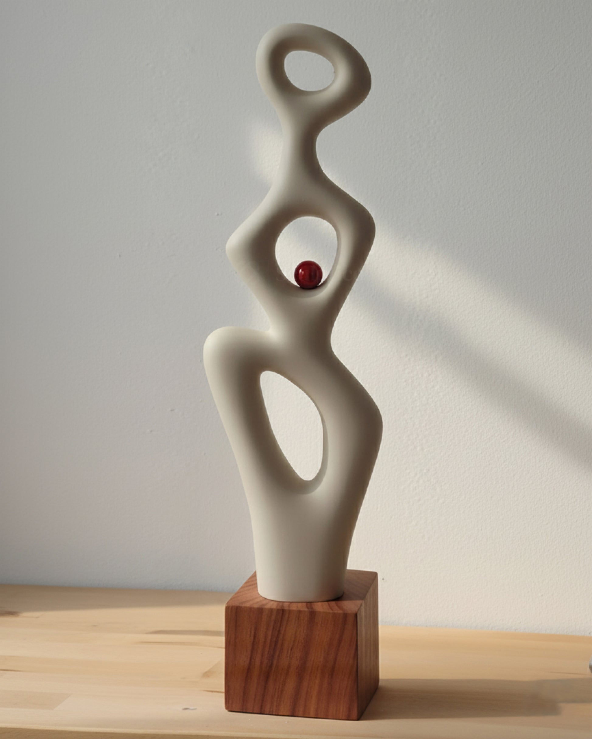 Set upon a wooden base, she becomes a reflection of life's most beautiful balance, calm and chaos, strength and softness, stillness and soul. Wherever she rests, she brings peace, poise, and an unspoken reminder that true beauty begins from within.