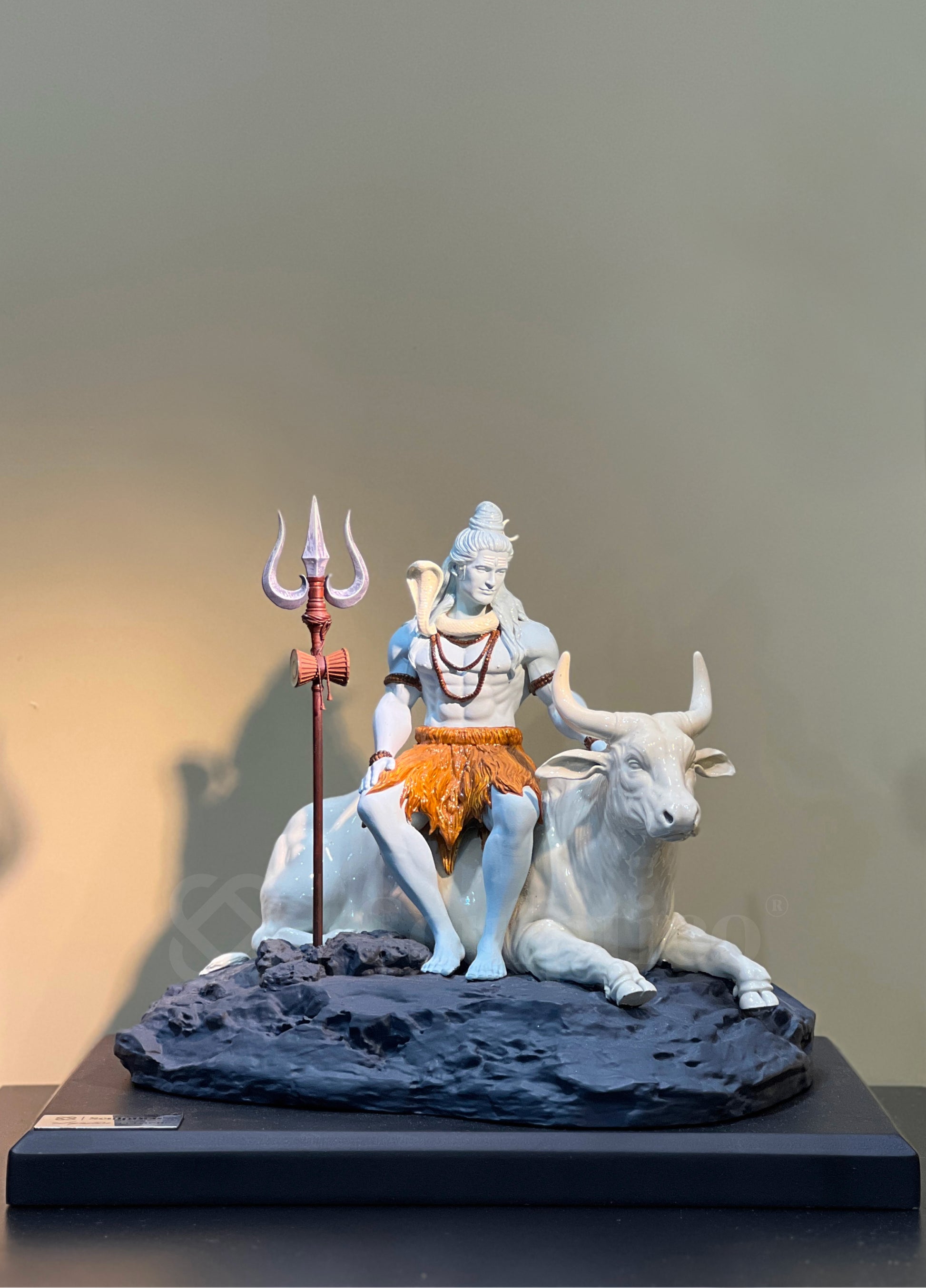 This stunning Signature Edition sculpture captures a serene and powerful moment of divine stillness—Lord Shiva seated gracefully atop a resting Nandi, his loyal companion, both poised on a rugged rock that speaks to the wild sanctity of the Himalayas. Shiva’s calm yet commanding presence exudes timeless wisdom, while Nandi rests beneath him in quiet devotion, embodying loyalty and strength. A finely detailed Trishul stands mounted beside them, symbolizing spiritual power and protection, anchoring the scene with sacred energy. Every curve and texture is crafted with care, blending elegance and depth to make this piece not just a sculpture, but a profound expression of faith, balance, and divine companionship.