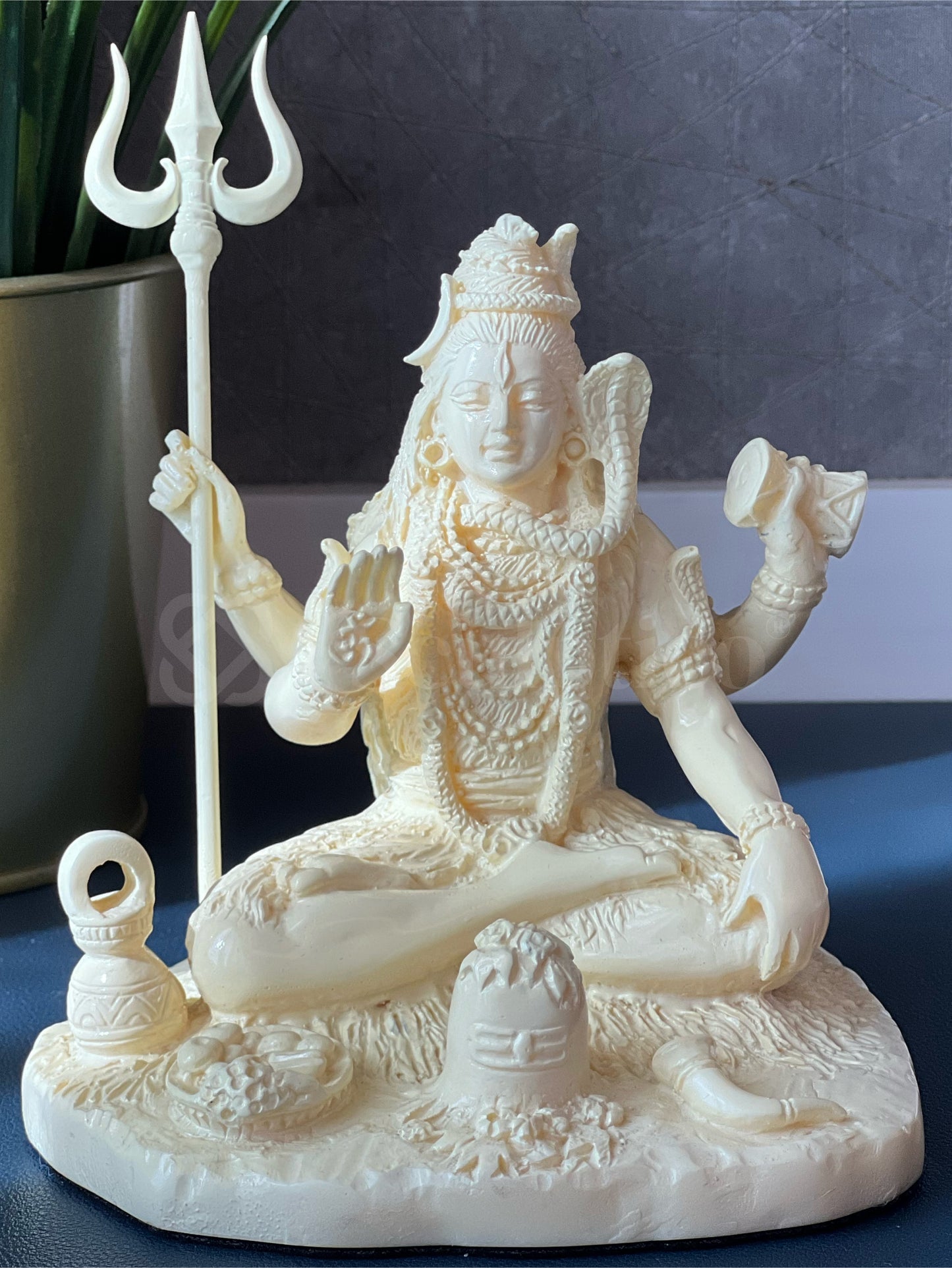 This elegant Lord Shiva sculpture, deep in meditation, emanates a blissful and serene aura. Its presence enhances the owner's experience by creating a peaceful ambiance, believed to grant wishes and bring about spiritual harmony to the space it graces.